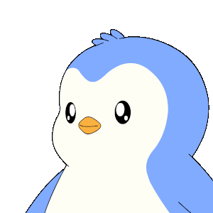 A happy cartoon penguin with blue and white feathers smiles with closed eyes, sticking out its tongue and blowing raspberries.