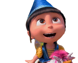 Agnes from Despicable Me joyfully laughs while riding her beloved unicorn toy, wearing a blue party hat.