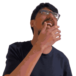 a man with glasses and a beard is laughing and covering his mouth with his hand