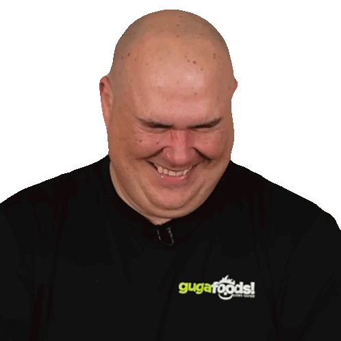 Gustavo Tosta from GugaFoods laughing heartily with eyes closed and a big, joyful smile.