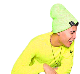 Gio And Eli laughing hysterically, slapping his knee in a neon yellow shirt and bright green beanie, full of joy.