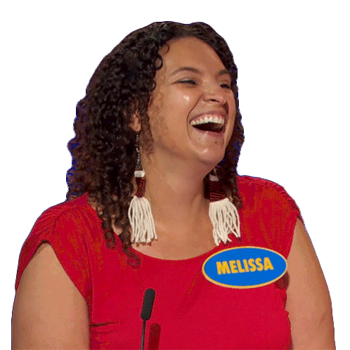 Melissa from Family Feud Canada bursts into laughter, wearing a red shirt and her name tag, sharing a hilarious moment.