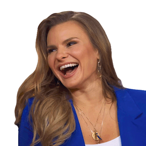 Michele Romanow bursts into laughter, head tilted back, wearing a blue jacket and white top, expressing pure joy.