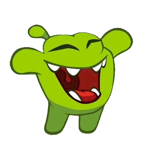 Om Nom from Cut the Rope laughs joyfully with a wide-open mouth, showing teeth and tongue.