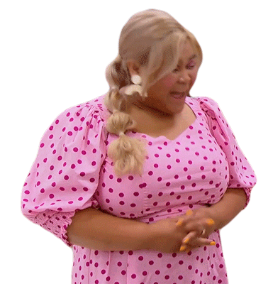 Ann Pornel from The Great Canadian Baking Show laughs heartily, holding her stomach in a pink polka-dot dress.