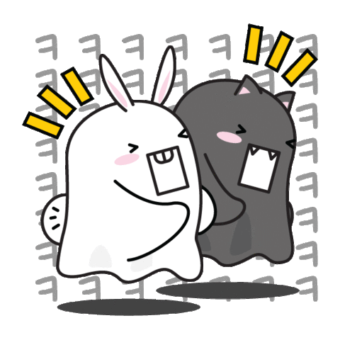 Two adorable ghost-like characters, one white and one black, laugh ecstatically with wide smiles and visible teeth, surrounded by Korean laughter symbols.