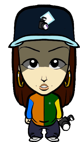 Laura Herradura of Freesis Mafia, a hip-hop and rap artist from Madrid, depicted as a cartoon photographer with a camera.