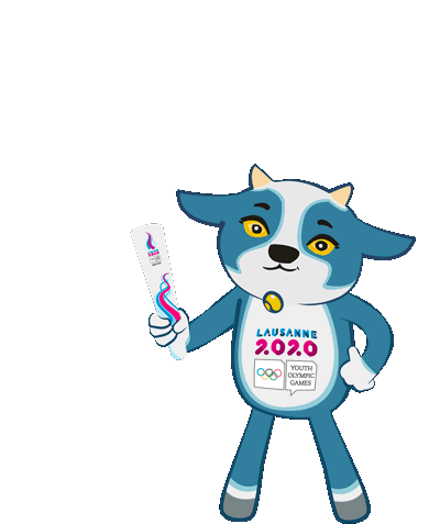 Yodli, the Lausanne 2020 Youth Olympic Games mascot, animatedly holds the Olympic torch, winking playfully.