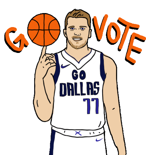 Luka Doncic, wearing his Dallas Mavericks jersey, spins a basketball while encouraging people to go vote.