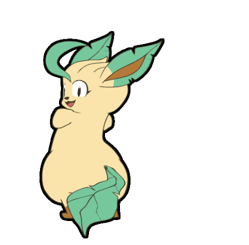 Leafeon, the Grass-type Eeveelution, happily dances with a cheerful expression, showcasing its leaf-like features.