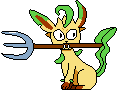 Leafeon, the beloved Pokémon, is depicted in pixel art, comically holding a pitchfork in its mouth as an animated sticker.