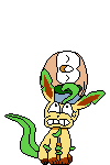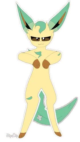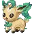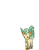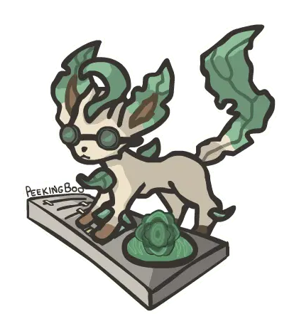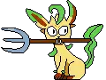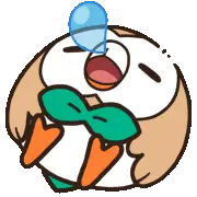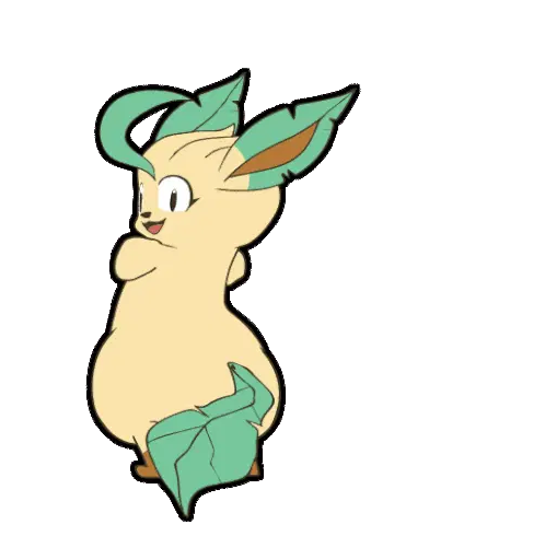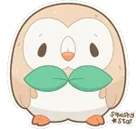 An animated pixel art sticker featuring Rowlet, a Pokémon character, holding a slice of pizza, with a nod to Leafeon.