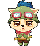 Animated sticker of Teemo from League of Legends, a sad cartoon character wearing a helmet and goggles, crying and begging.