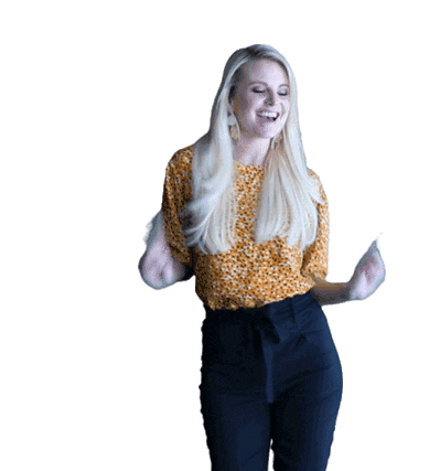 Leah Leahmusiek, a blonde woman, smiles brightly and points with both hands, creating an energetic and positive animated sticker.