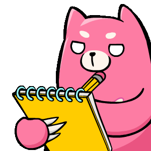 A pink Wakuma bear holds a yellow notebook and pencil in its mouth, appearing to learn or write.