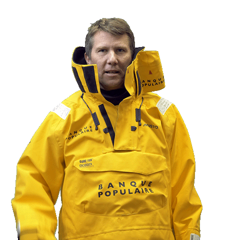 Yann Courtois, a sailor from Banque Populaire, waves goodbye in his yellow Musto Gore-Tex jacket, signaling a departure.