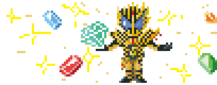 a pixel art of a knight holding a sword and a ring surrounded by gems .