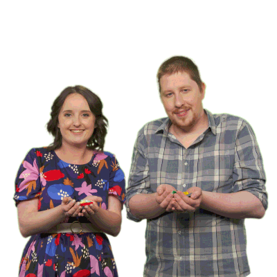 Tim and Dannii from Lego Masters Australia are delighted as colorful Lego bricks fall around them, smiling playfully.
