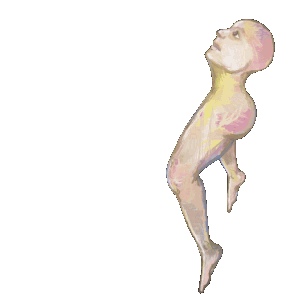 A surreal drawing of a person with exaggerated legs, appearing to float or lie on their back in an unusual pose.
