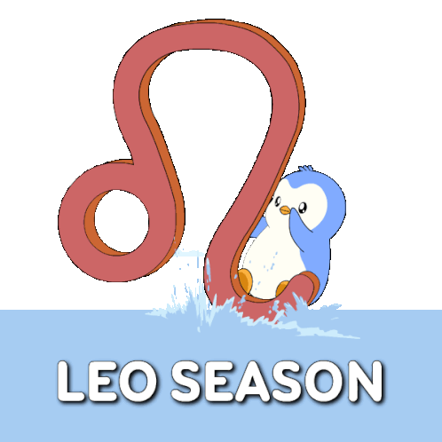 A cute blue and white penguin splashes happily inside a stylized red Leo zodiac sign, celebrating Leo Season.