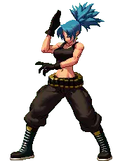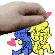 The Leona Kingscholar Twst character, a blue and yellow figure with pink hearts, is held by a hand.