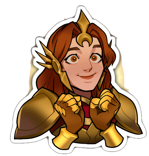 Leona from Legends of Runeterra expresses pure joy with a radiant, happy emote, clenching her fists in golden armor.