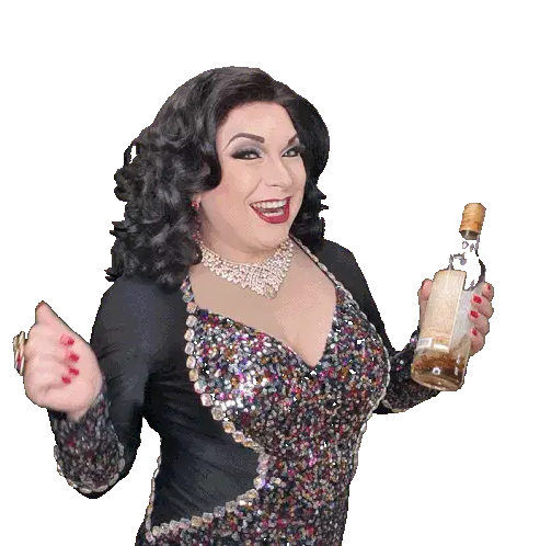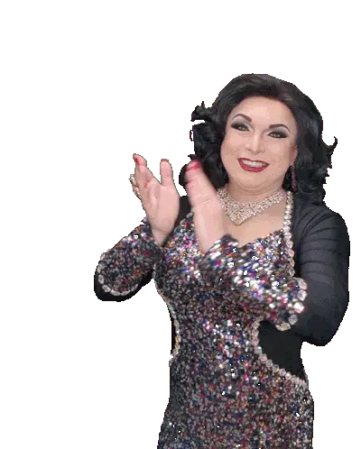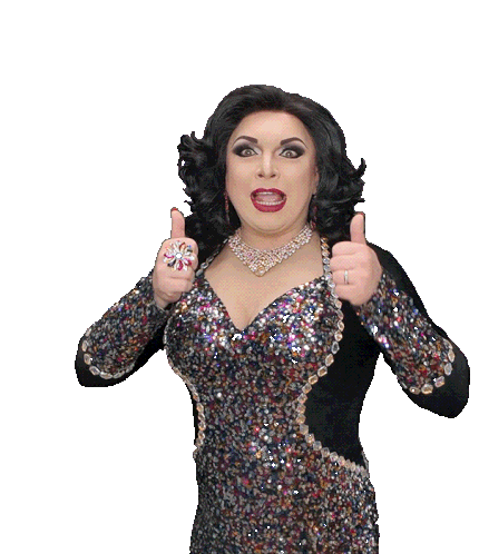 Vallerywoods, a performer in a dazzling sequined dress, gives an enthusiastic double thumbs up with a big smile.