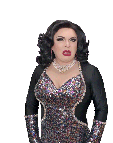 Vallerywoods, a drag queen in a sequined dress, makes a disgusted then pouty face, showing expressive reactions.