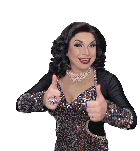 Vallerywoods, a woman in a dazzling sequined dress, enthusiastically gives two thumbs up, showing approval and excitement.