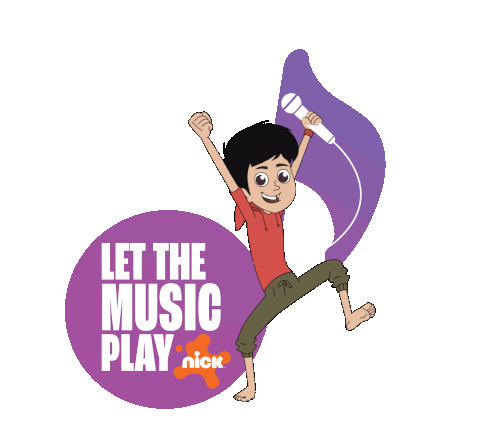 a cartoon boy holding a microphone with the words let the music play nick below him