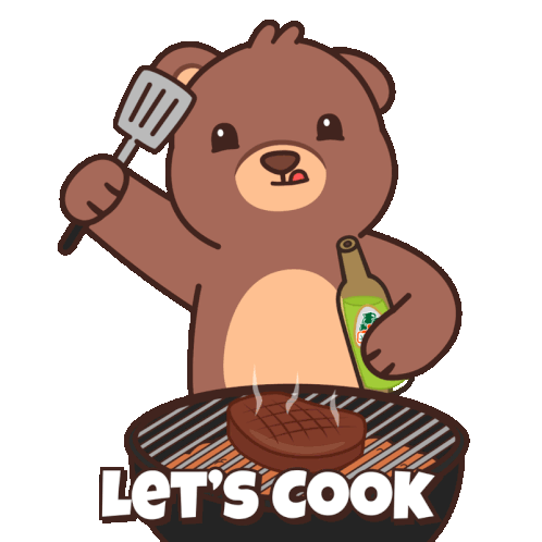 A cute cartoon bear enthusiastically grills a steak on a BBQ, holding a spatula and a bottle, with the text "Let's cook."