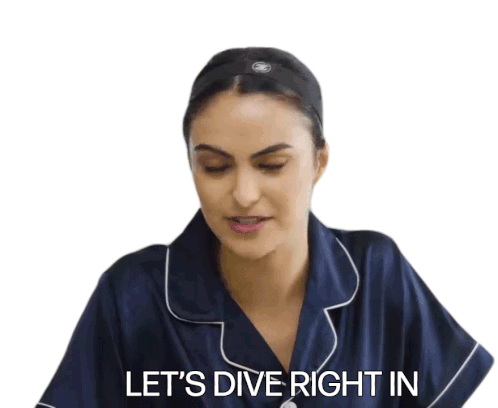 Camila Mendes, wearing blue pajamas, says 'Let's Dive Right In' with an encouraging smile.