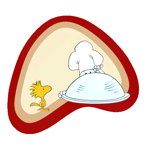 Snoopy as a chef presents a roasted turkey to Woodstock, with "LET'S EAT!" text for Thanksgiving.