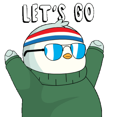 Animated penguin in sunglasses and headband, pumping fists, with 'LET'S GO' text, expressing excitement and hype.