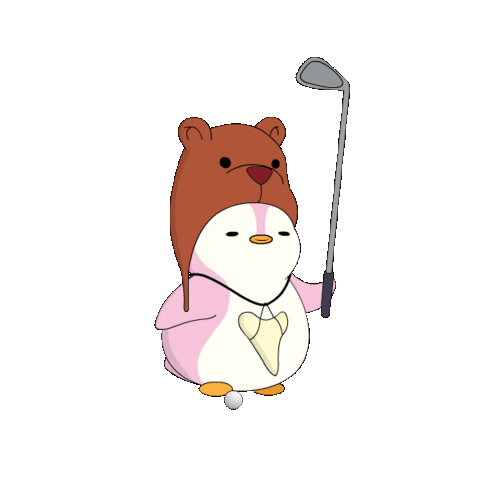 A cute cartoon penguin in a bear hat swings a golf club, followed by the text "SEND IT".