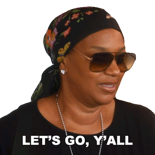 Jackie Christie, wearing sunglasses and a bandana, energetically says "Let's Go, Y'all" in this animated sticker.