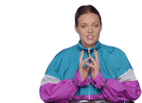 A woman in a colorful track jacket makes a thoughtful and slightly anxious expression, bringing her hands together as if analyzing something.