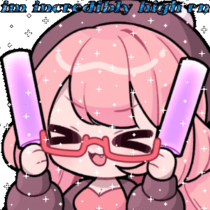 Leveta Lunaty, the VTuber, animated with glasses and pink hair, holding glowing purple lights and displaying 'I'm incredibly high'.