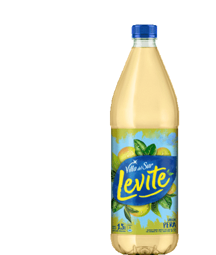 An animated sticker featuring a bottle of Villa del Sur Levité pear-flavored juice, with pears and leaves appearing around it.