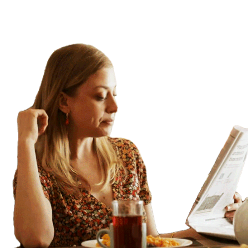 A woman from Backdoor calmly reads the newspaper while enjoying her breakfast, starting the day relaxed.