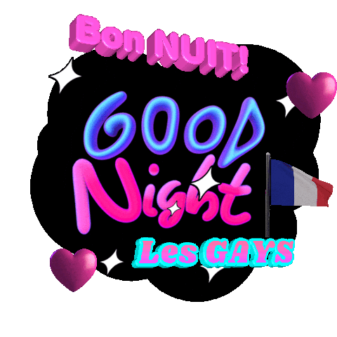 A vibrant 'Good Night Les GAYS' sticker with pink and blue text, hearts, and a French flag, perfect for LGBTQ+ greetings.