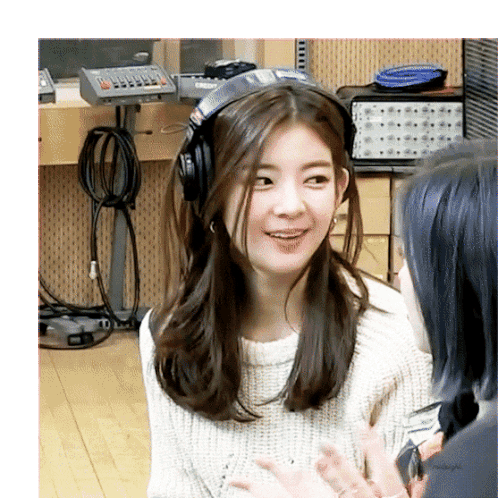 a woman wearing headphones and a white sweater is talking to another woman .