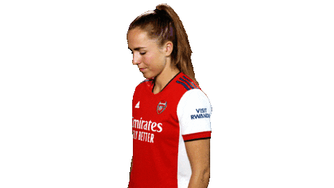 Lia Walti, wearing her Arsenal women's football jersey, looks up and crosses her arms with a confident smile.