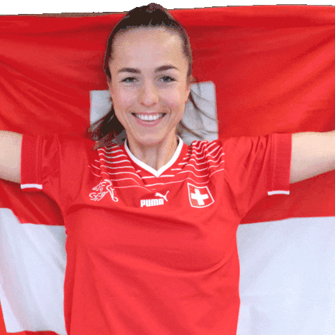 Lia Walti, the Swiss Nati football star, smiles proudly while holding the vibrant Swiss flag, celebrating her national team.