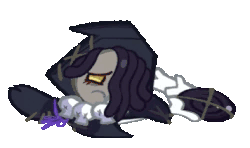 Licorice Cookie from Cookie Run is depicted in pixel art, lying on its side, looking upset and possibly crying.
