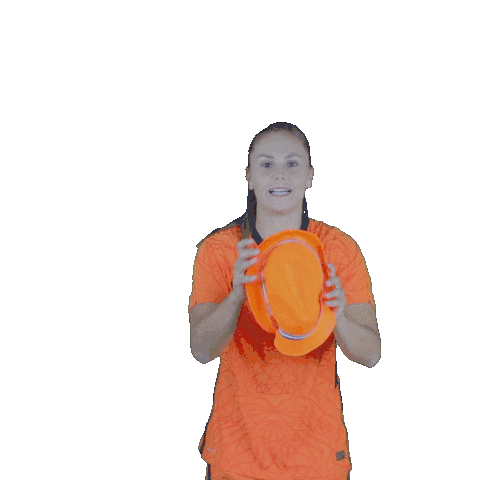 Lieke Martens, a star of the Oranje Leeuwinnen, playfully reveals an orange hat, then places it on her head with a smile.