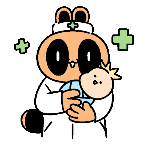 A friendly cartoon doctor or nurse character, possibly a tanuki, holds a baby, symbolizing medical care, clinics, and life insurance.
