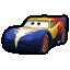 a blue and yellow cartoon car from the movie cars is sitting on a white background .