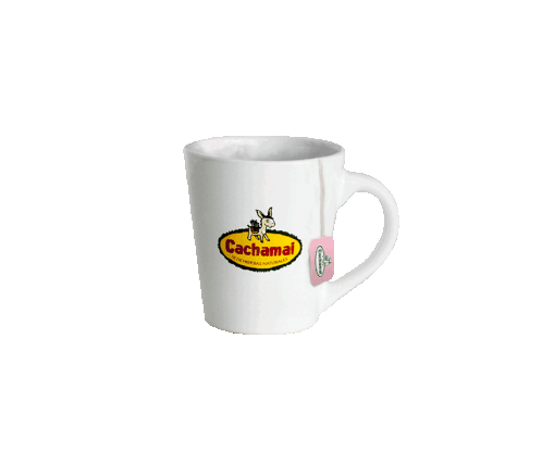 White Cachamai tea mug with a pink tea bag tag, showing animated social media 'like' hearts appearing.