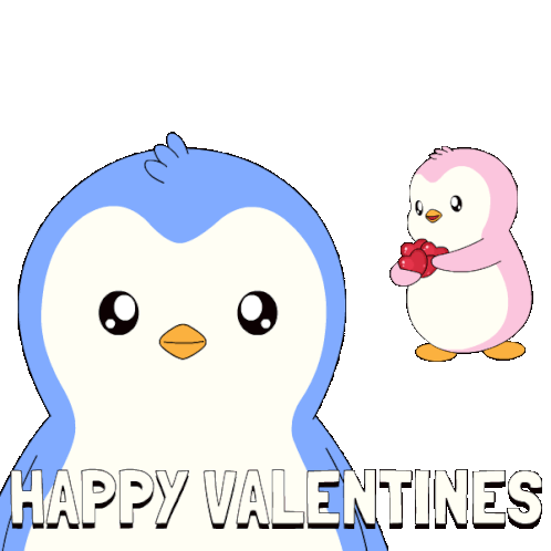 a happy valentines greeting card with a blue penguin holding a red heart